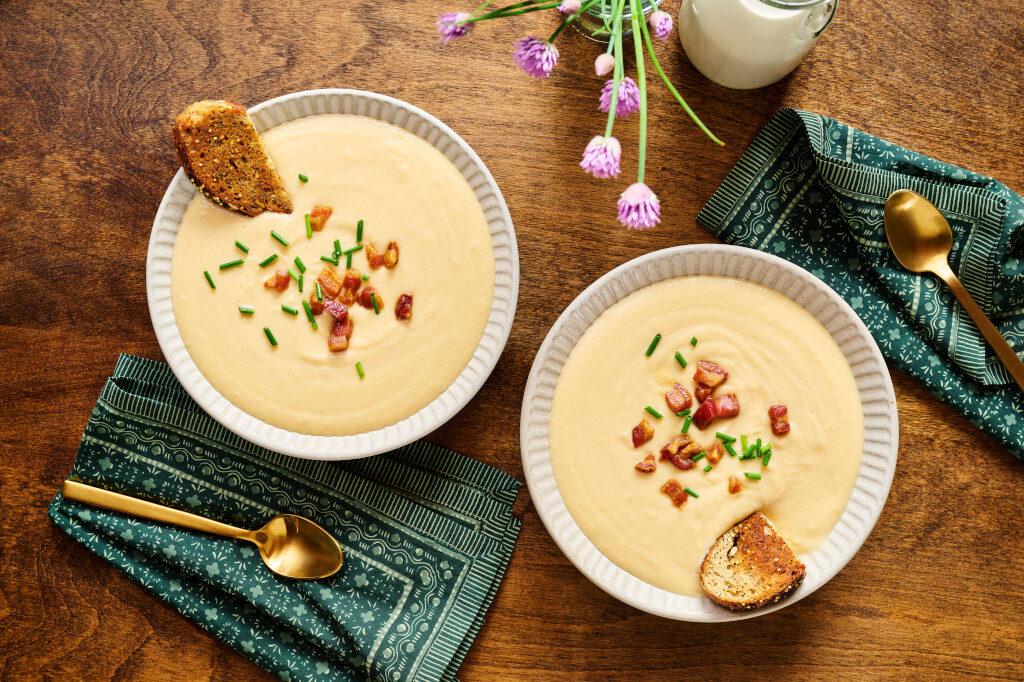 Using an immersion blender, blend soup until smooth (alternatively, you can use a blender and puree the soup in batches, making sure the middle of the blender top is removed to allow steam to escape). Return soup to pot and bring to a simmer, then stir in Dijon mustard and cheeses. Serve in bowls with bacon and chives.